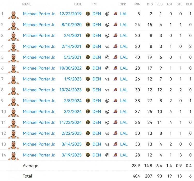 让我们来看看小波特打湖人的14场比赛的单场数据吧,最高砍下共27分8篮板2助攻。